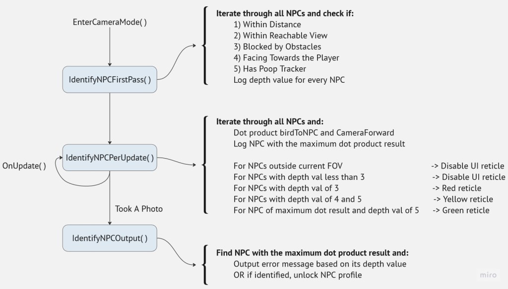 The NPC identifying algorithm is divided into three parts. Every time the player opens up the spy camera, the algorithm runs a first pass to assign a depth value to every NPC based on the number of tests it passes. Computationally expensive tests are executed later when most of the candidates have already been weeded out.