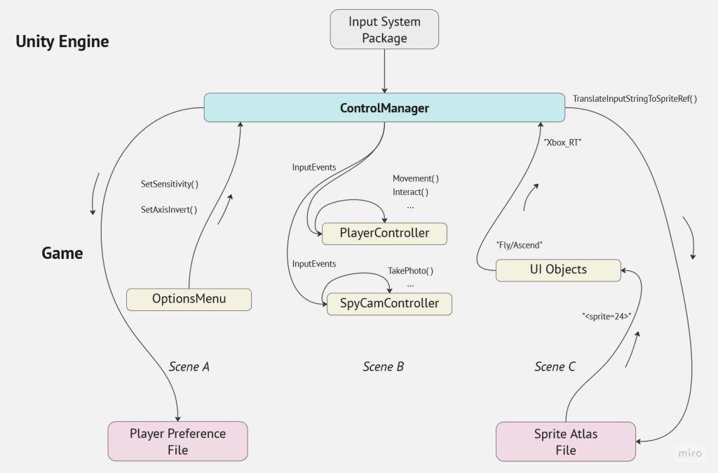 A singleton manager was utilized to encapsulate functions provided by Unity’s Input System, handling everything from input processing to event dispatching. This ControlManager also stores the mapping of inputs to sprite sheets and translates requests at runtime.