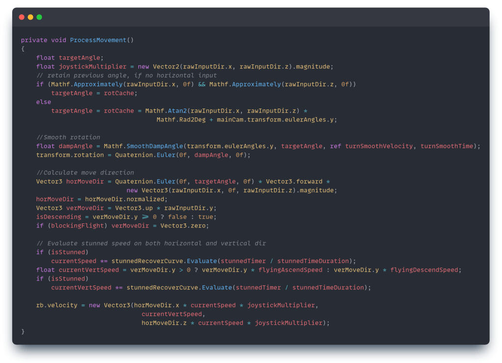 The ProcessMovement() function is the crux of the third-person controller, which I coded from the ground up for this project. This is the current version after many iterations.