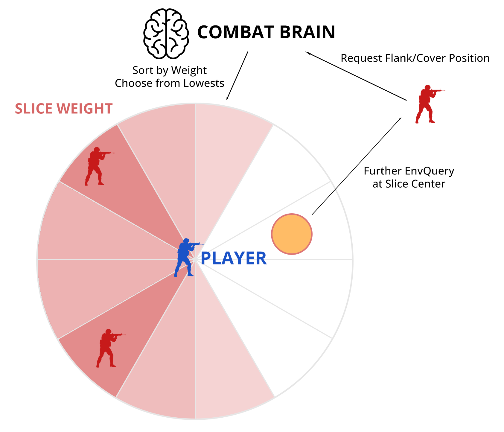 During combat, the system divides the battlefield into arbitrary number of angular slices, originated from the player. If an AI occupies a slice, cascading weights are applied to that slice and its neighbors to discourage clustering. When an AI needs to reposition, Combat Brain randomly selects from the lowest-weight slices. The AI will then find a new cover via EnvQuery, encircle the player and provide them a more challenging fight.